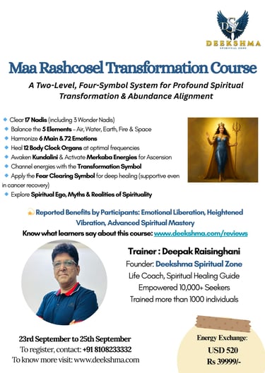 The Maa Rashcosel Transformation Course is a powerful training designed to help you elevate your consciousness, release emotional blockages, and align with abundance. Through a unique four-symbol system, you will gain tools for deep spiritual transformation, energy mastery, and personal empowerment.