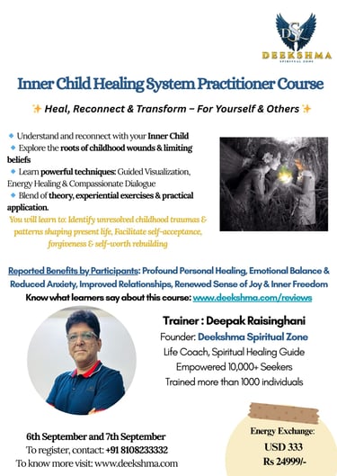 Our Inner Child Healing System Practitioner Course is a transformative training designed to help you reconnect with your inner child and guide others on their healing journey. Through this immersive program, you will explore the roots of childhood wounds and limiting beliefs, while learning powerful techniques that bring deep emotional and spiritual transformation.
