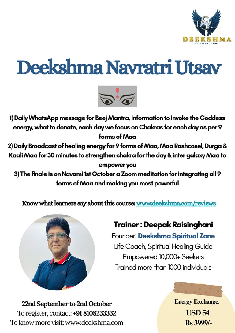 Join us for the Deekshma Navratri Utsav, a 17-day spiritual celebration honoring the 9 forms of Maa. This program combines daily mantra guidance, energy broadcasts, and meditative practices to strengthen your chakras, awaken divine energy, and empower you on multiple levels.